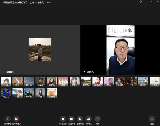 为进一步提升教职工政治理论素养,提高思想境界,学院于2020年10月28日下午1点半通过企业微信平台召开了10月份教职工政治理论学习会议。会议由办公室负责人徐鹏飞老师主持,学院全体教职工参加。