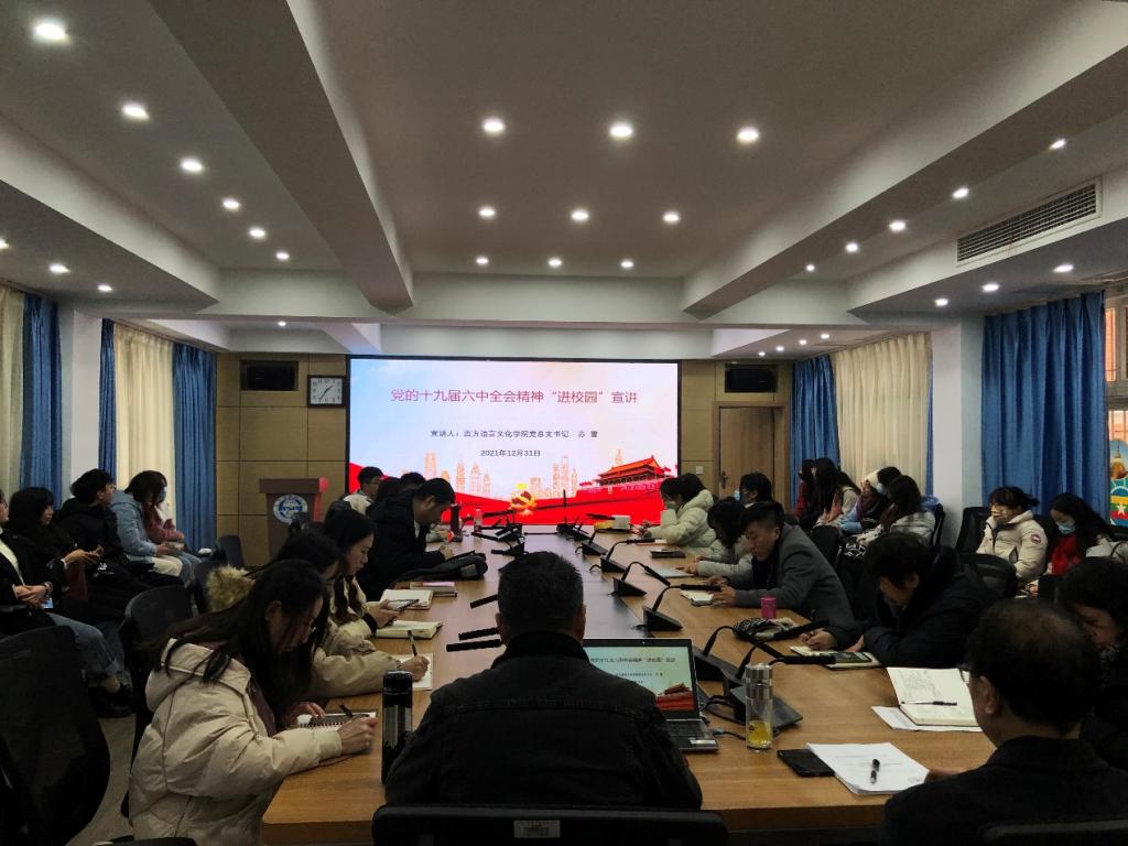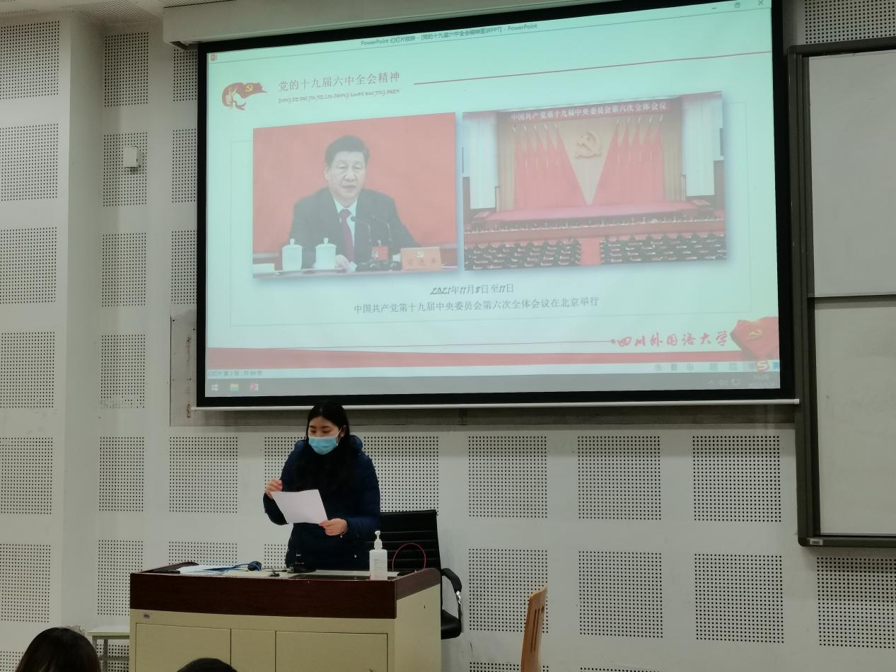 2021年12月31日,学院党总支书记苏雪在文轩楼103会议室分别为全院教职工和全院师生党员进行了的党的十九届六中全会精神宣讲。苏雪书记在宣讲中指出,党的十九届六中全会是在重大历史关头召开的一次在党的历史上具有重大历史意义、里程碑意义的重要会议。全会审议通过的《中共中央关于党的百年奋斗重大成就和历史经验的决议》,是一篇马克思主义的纲领性文献,是新时代中国共产党人牢记初心使命、坚持和发展中国特色社会主义的政治宣言,是以史为鉴、开创未来、实现中华民族伟大复兴的行动指南。