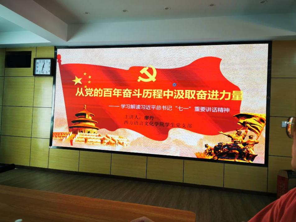 第一部分是党支部书记廖丹老师围绕习近平总书记“七一”重要讲话精神,为全体党员上了一堂微党课—从党的百年奋斗历程中汲取奋进力量。该党课围绕三个部分展开,分别是“‘七一’重要讲话是激励全党全国各族人民向第二个百年奋斗目标进军的政治宣言和行动纲领”、“深入学习领会习近平总书记重要讲话提出的新思想、新观点、新要求”、“深入学习习近平总书记重要讲话精神,矢志践行初心使命,奋力开创光辉未来”。