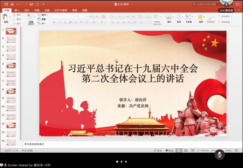 最后,廖丹老师对此次因为疫情而进行的线上活动作了说明,敦促大家线下要加强自学,领会文件精神。呼吁大家在疫情期间,党员同志要积极承担自己的责任,发挥先锋模范作用,做好先进表率。