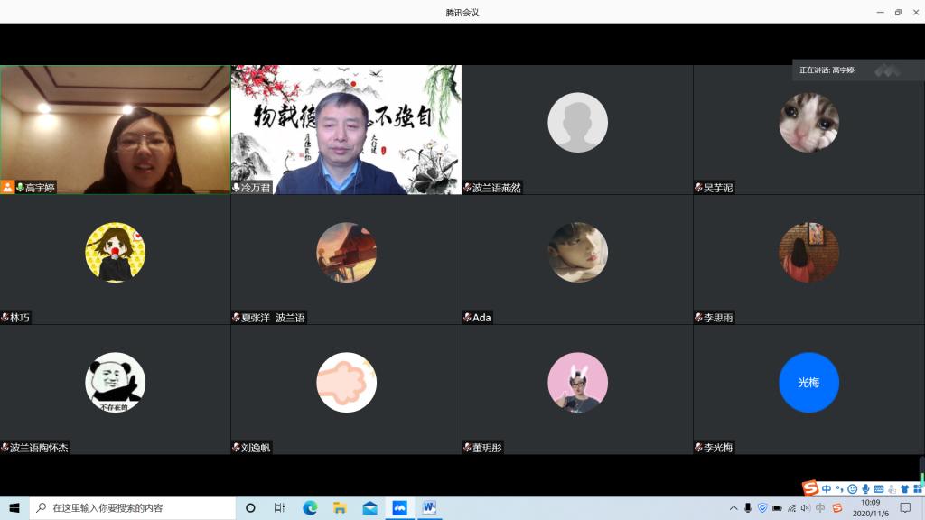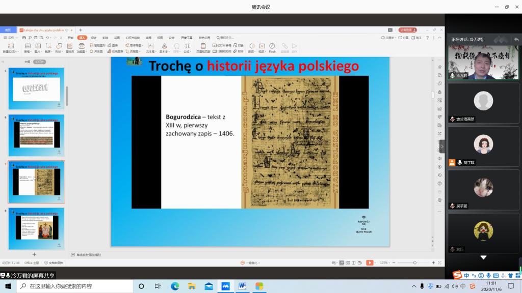 2020年11月6日上午,我院波兰语专业在线上开展了现代波兰语学习专题讲座。本场讲座邀请了哈尔滨师范大学波兰语专业冷万君老师为同学们在线讲解波兰语的演变历史和现代波兰语的语体使用情况。波兰语全体师生共同参与了本次专题讲座。