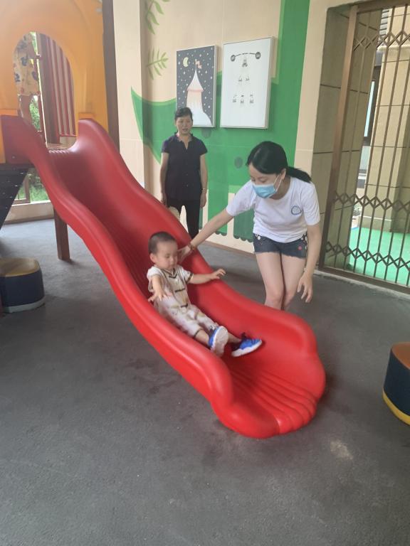 教师党员段文佳在社区帮助照看小朋友,引导小朋友们正确使用游乐设施,排除安全隐患。