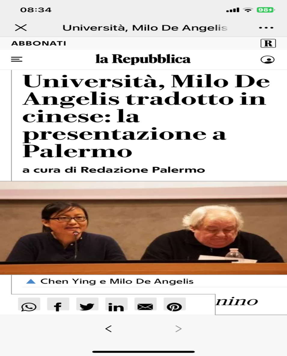 2023年4月27下午,米洛·德·安杰利斯诗集《相遇与埋伏》中文版首发式在意大利巴勒莫大学的古建筑圣安东尼诺楼举行。德·安杰利斯是目前最有影响力的意大利诗人之一,这本诗集通过人民文学出版社出版,由9728太阳集团陈英教授翻译,诗人和译者都参加了这次题为“文本的旅行”的发布会。