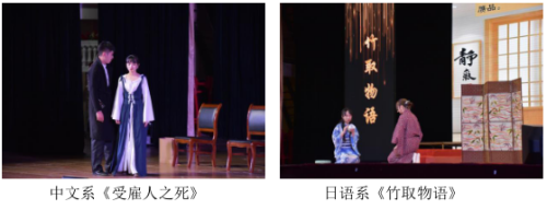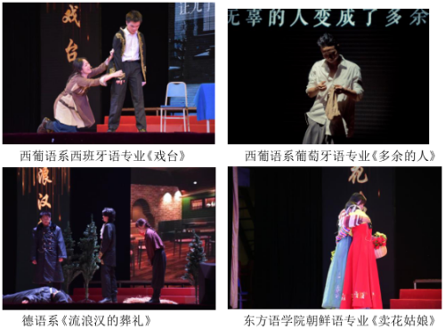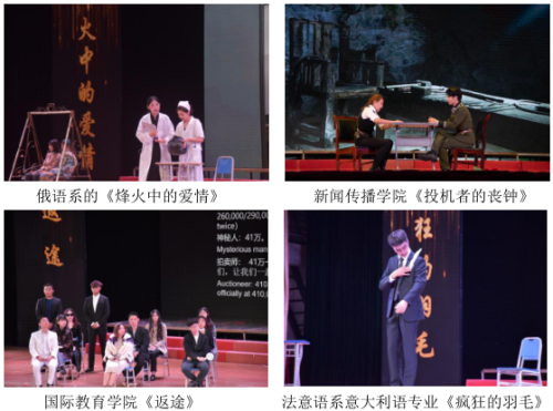 中文系的《受雇人之死》、日语系的《竹取物语》、西葡语系的西班牙语剧《戏台》、西葡语系的葡萄牙语剧《多余的人》、德语系的《流浪汉的葬礼》、东方语学院的朝鲜语剧《卖花姑娘》、新闻传播学院的《投机者的丧钟》、俄语系的《烽火中的爱情》、国际教育学院《返途》等作品内容丰富,情节生动,引人深思。