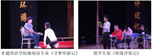 商务英语学院的《罗密欧与朱丽叶》、国际商学院的《百万英镑》、英语学院的《不老泉》、翻译学院的《金锁记》、法意语系法语专业的《红与黑》、东方语学院泰语专业的《情牵两世》、重庆非通用语学院缅甸语专业的《寻梦环游记》、留学生部的《班级评优记》等作品以中外文学著作或影视作品为素材,通过全新演绎再现经典的魅力。