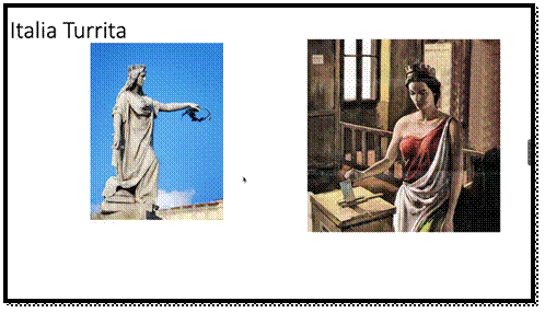 随后,潘老师为我们介绍了希腊雕塑家欧提开德斯(Eutichides)的作品。公元前4世纪,欧提开德斯雕刻了一尊王冠女人像,女人头顶的王冠和封闭的城墙——城邦很像。潘老师表示,城墙是共同体的清晰边界,闭合的城墙构建了国家的雏形。同时,他以此引出了意大利的拟人化形象,即“Italia Turrita”(有城墙的意大利)。