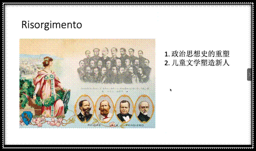 复兴运动时期,为了重塑“意大利人”的政治思想,儿童文学也承担了一定的社会功能。潘老师为我们详细地讲解了《爱的教育》和《木偶奇遇记》两部作品反应出的社会问题和国家形象。《爱的教育》以写实的手法,记录了小男孩安利柯在北部城市都灵的生活,创造了一个教育乌托邦,同时深刻地展示了意大利这个新兴国家和教会的关系。他指出,《木偶奇遇记》的故事背景是托斯卡纳地区的小乡村,故事中的木偶人匹诺曹无拘无束,我们能从他的身上,看见卢梭笔下爱弥尔的影子。卡洛·科洛迪为匹诺曹安排了一个木匠父亲,派仙女指引匹诺曹回归校园,实际上是作者提出的政治国家和教会之间的和解方案。