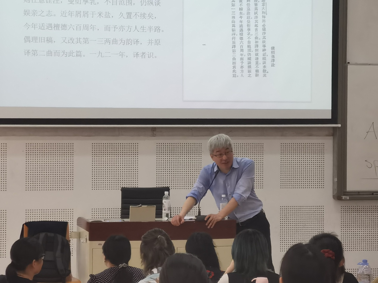 讲座伊始,文铮教授以幽默轻松的语言讲述了中意两国关系发展和演变的历史,并以此为切入点,阐述了但丁在意大利语言文化和中意文化交流方面做出的巨大贡献。而后,文铮教授又介绍了《神曲》和《新生》两部作品的内容和核心思想。在这之中,教授着重介绍了《神曲》在中国的传播和它对中国文化发展做出的贡献,让学生了解到了中意文化相互交流、相互促进的繁荣历史。讲座最后,文铮教授热情地回答了学生提出的问题,并给学生提出了关于研究但丁文化的宝贵意见。