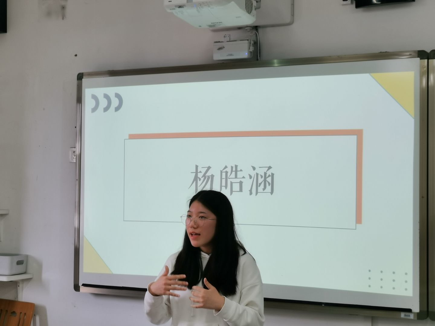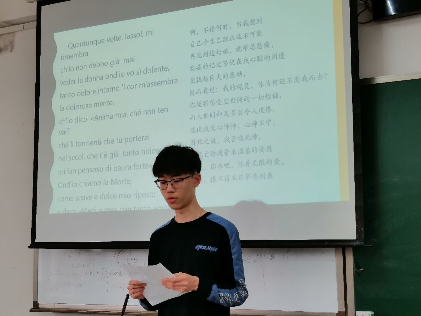 活动伊始,李书竹老师请参赛同学抽签决定上场顺序。抽签完毕后,同学们就自己选取的《新生》诗集片段,依次上台进行朗诵。选手们声情并茂、抑扬顿挫,动情的朗诵搭配上制作精美的PPT以及背景音乐,为在场的所有人带来了一场意大利语诗集的视听盛宴,赢得阵阵热烈掌声。最后,经过评委老师的讨论和打分,尹章全同学荣获本次朗诵比赛一等奖;田文静同学、李东奇同学以及刘芷怡同学获大赛二等奖;崔玮捷同学、丁雨馨同学、黄丹艺同学以及陈洁同学也获得了三等奖。