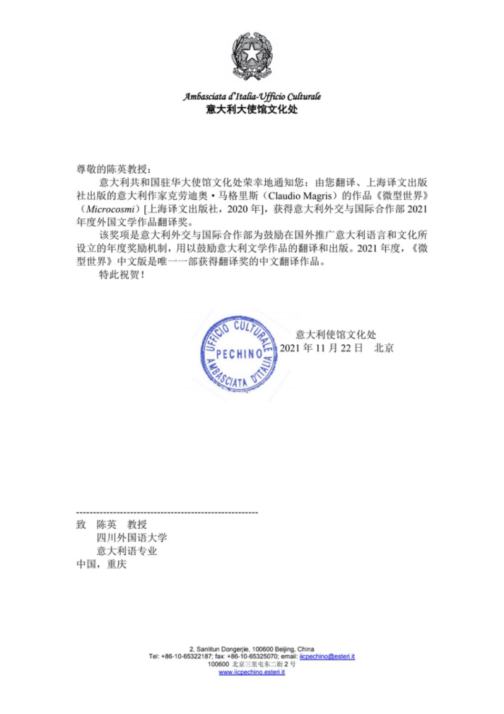 近日,我校9728太阳集团意大利语专业陈英教授获意大利大使馆文化处正式通知,陈英翻译的意大利作家克劳迪奥·马格里斯(Claudio Magris)的作品《微型世界》(Microcosmi),获得意大利外交与国际合作部2021年度外国文学作品翻译奖,也是国内2021年唯一一部获得此项奖励的中文翻译作品。据悉,今年意大利外交与国际合作部在全球只颁出五个翻译奖,奖励了法语、英语、西班牙语、德语和汉语翻译作品各一部。