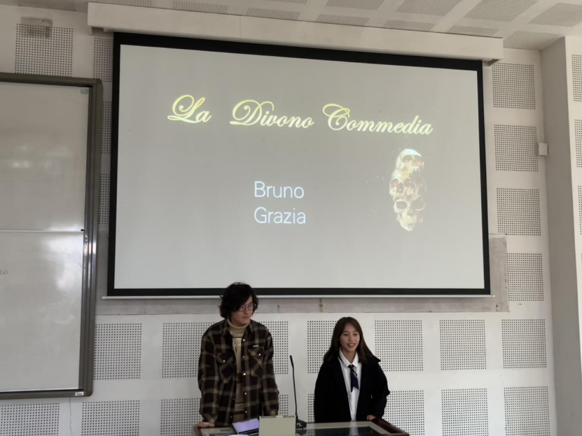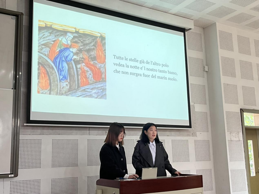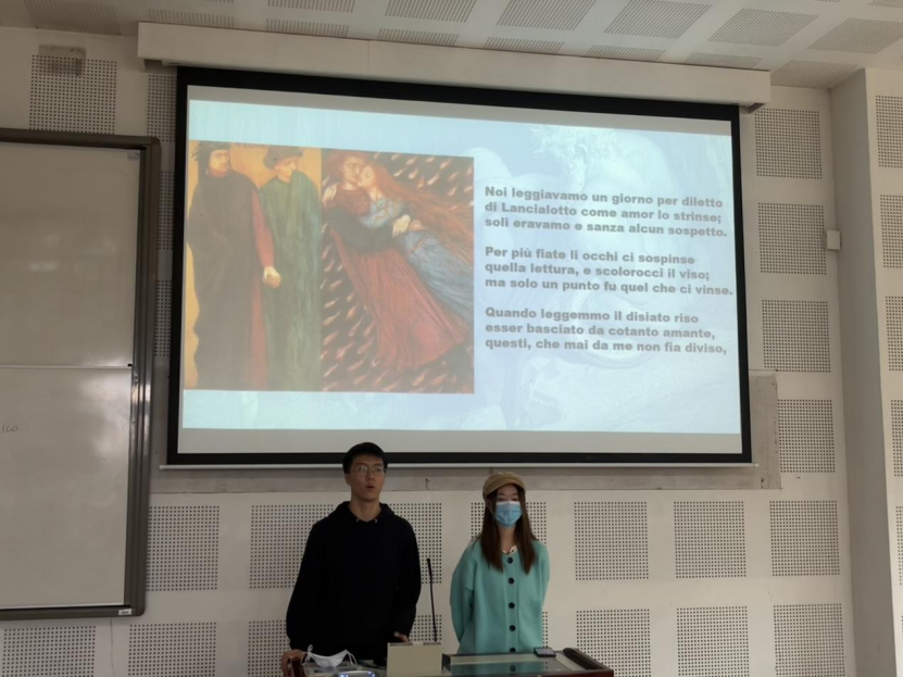 首先,评委老师展出了一段由同学们参演的意大利语戏剧表演视频。随后,但丁诗句朗诵比赛正式开始。2020级章玙瑞、王诗怡组,尹鹏谨、杨柳清组,车馨雨、崔玮婕组;2019级赵若伶、赵宇浩组,吕佳翼、汤子瑶组,李蕊、丁雨馨组,陈语、于冰清组分别选取了部分但丁诗句,用精彩的PPT展示和激情澎湃的朗诵向我们展现了意大利语的神秘魅力,更令我们深刻地感受到处于黑暗时代的但丁蕴于诗句中奋起反抗、反对压迫、崇尚自由的强大精神力量,使同学们感受到深深的震撼之情。