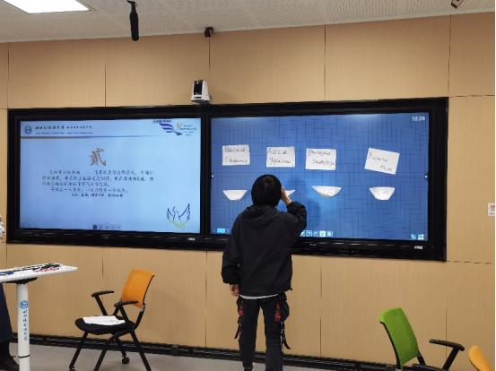 接下来是“文学常识之作家代表作连线”。每组派出一名同学参与;为增加该游戏难度并考查同学们对文学知识掌握情况,游戏规则设置为每名队员出发连词前需要在原地转5圈,再跑到答题板前进行连线,正确率高者为胜。